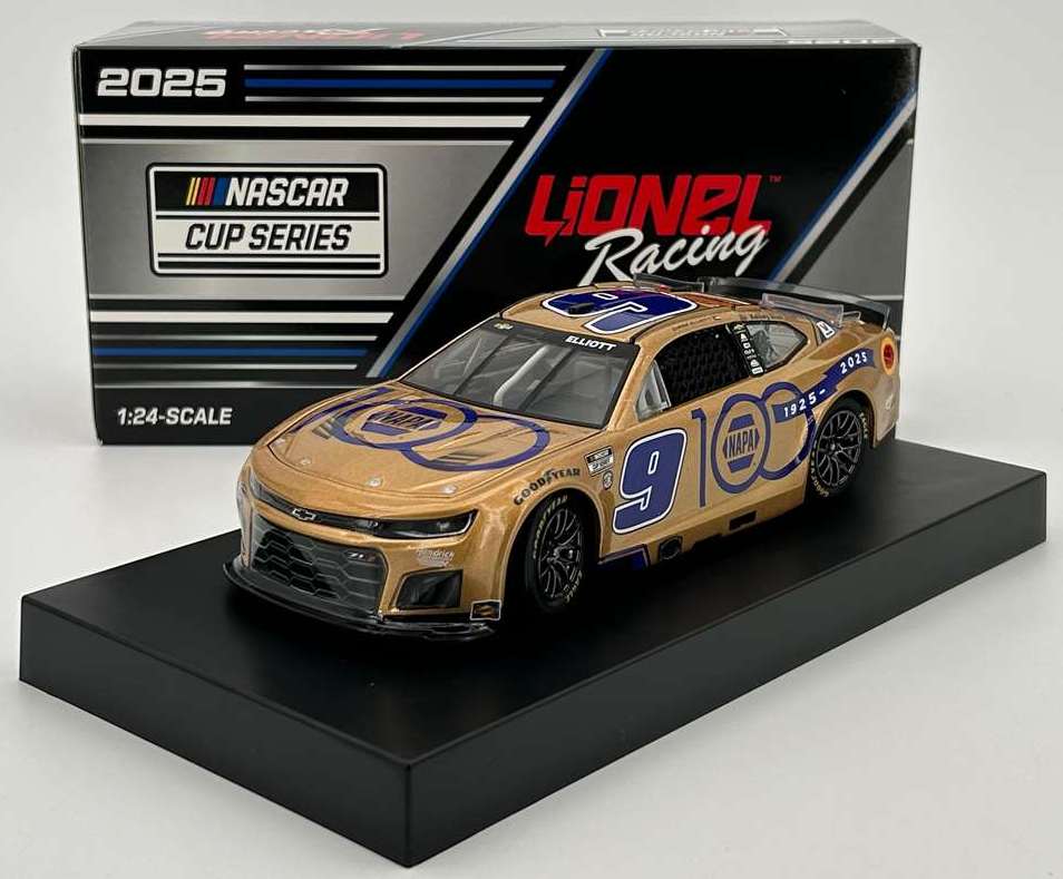 2025 Chase Elliott #9 NAPA Gold / Chevrolet Camaro ZL1 NASCAR 1/24 diecast, by Action Lionel. The Hendrick Motorsports #9 NAPA Auto Parts Gold 100th Anniversary Chevrolet Camaro ZL1 was raced by Chase Elliott in the NASCAR Cup, Wurth 400 presented by LIQUI MOLY at Texas Motor Speedway on May 4, 2025. This golden livery celebrates NAPA Auto Parts 100th anniversary.