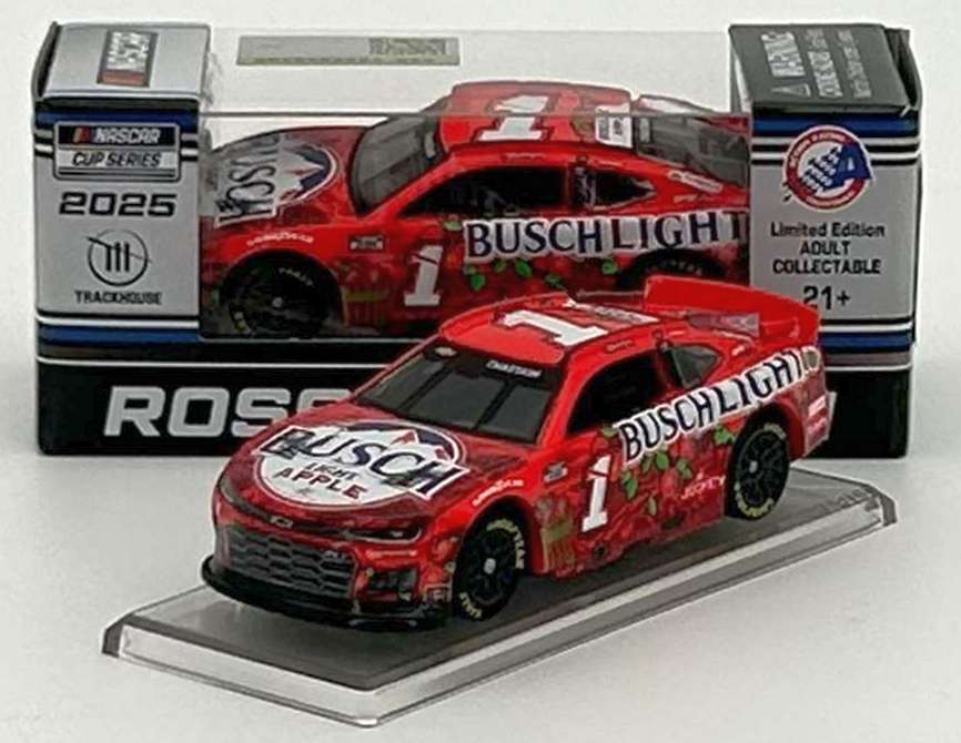 2025 Ross Chastain #1 Busch Light Apple / Chevrolet Camaro ZL1 NASCAR 1/64 diecast, by Action Lionel. The Trackhouse Racing #1 Busch Light Apple Chevrolet Camaro ZL1 was raced by Ross Chastain in 3 events during the 2025 NASCAR Cup season. This diecast car will be displayed on a clear base.