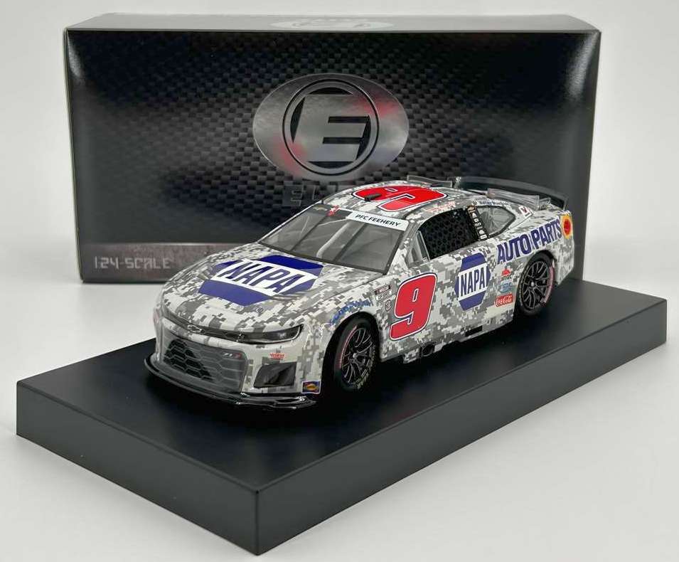 2025 Chase Elliott #9 NAPA Salutes / Chevrolet Camaro ZL1 NASCAR 1/24 diecast, by Action Lionel. The Hendrick Motorsports #9 NAPA Salutes Chevrolet Camaro ZL1 was raced by Chase Elliott in the NASCAR Cup, Coca-Cola 600 at Charlotte Motor Speedway on May 25, 2025.