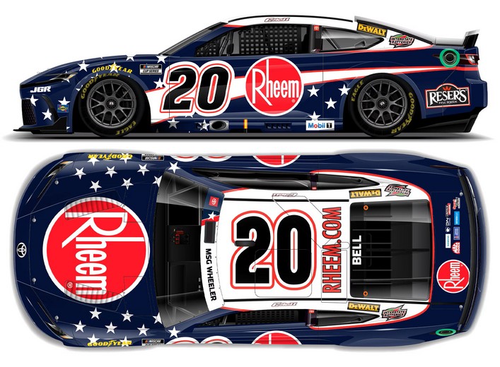 2025 Christopher Bell #20 Rheem Salutes / Toyota Camry XSE NASCAR 1/64 diecast, by Action Lionel. The Joe Gibbs Racing #20 Rheem Salutes Toyota Camry XSE was raced to a top-10 finish by Christopher Bell in the NASCAR Cup, Coca-Cola 600 at Charlotte Motor Speedway on May 25, 2025.