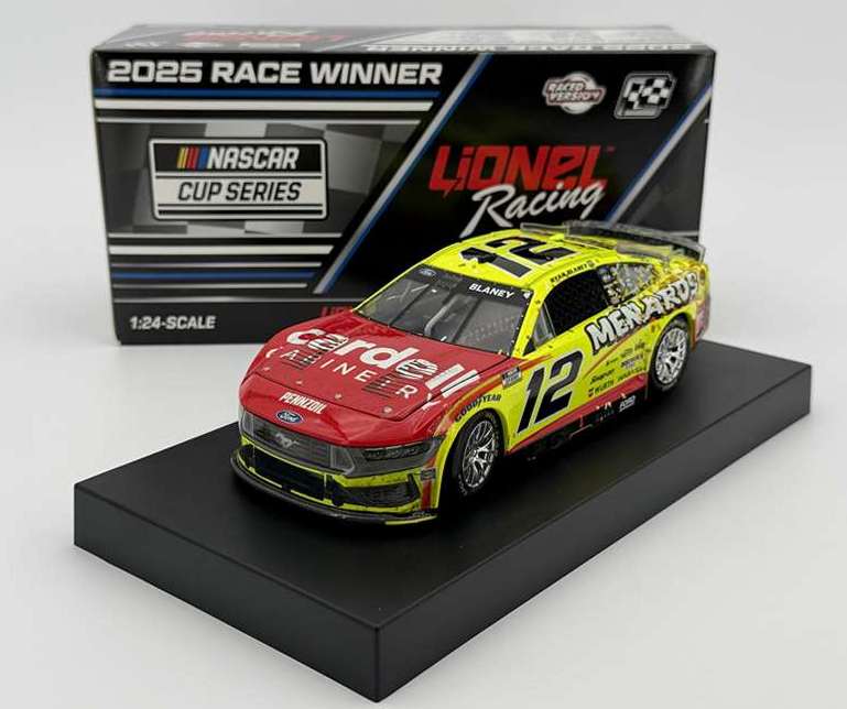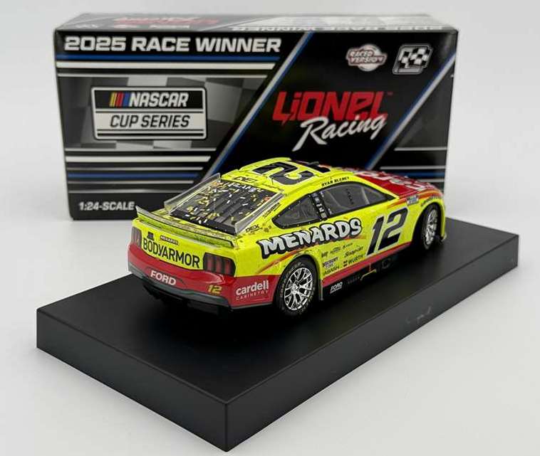 2025 Ryan Blaney #12 Menards / Nashville Win / Raced Version / Ford Mustang NASCAR 1/24 diecast, by Action Lionel. Ryan Blaney raced this Team Penske #12 Menards Cardell Ford Mustang to victory in the NASCAR Cup, Cracker Barrel 400 at Nashville Superspeedway on June 1, 2025.