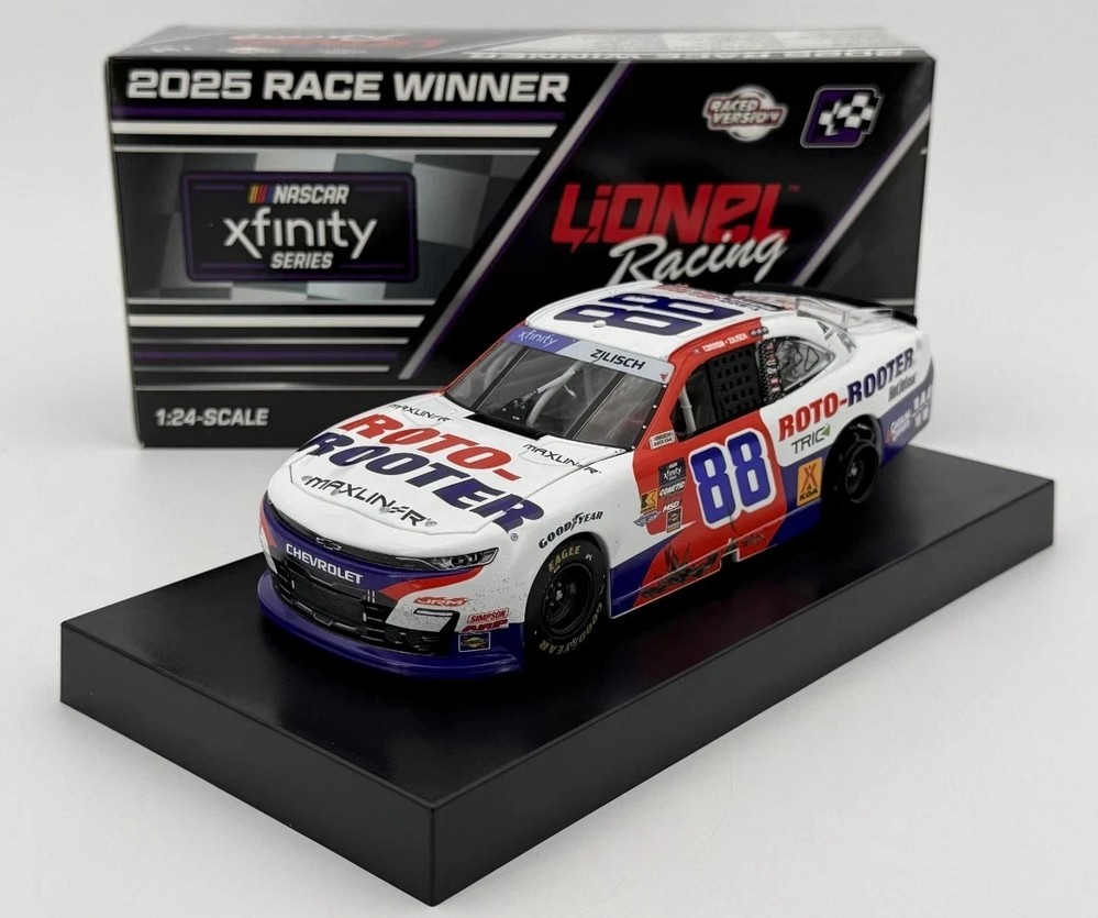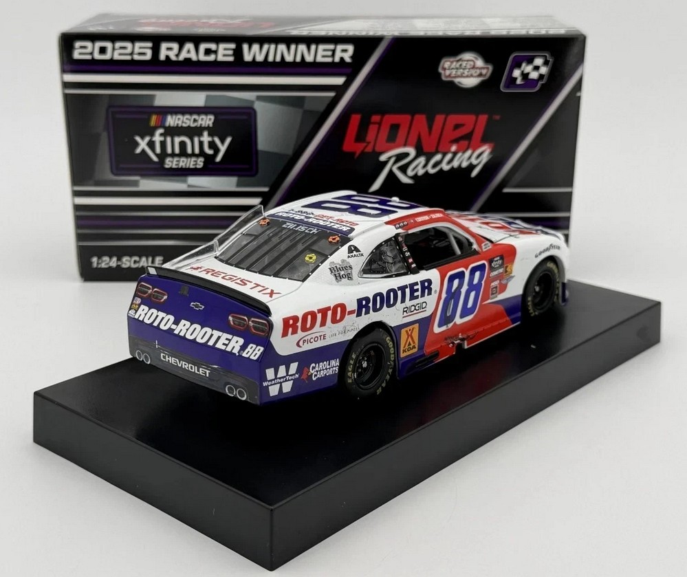 2025 Connor Zilisch #88 Roto-Rooter / Sonoma Win / Raced Version / Chevrolet Camaro NASCAR 1/24 diecast, by Action Lionel. Connor Zilisch raced this JR Motorsports #88 Roto-Rooter Chevrolet Camaro to victory in the NASCAR xfinity Series, Pit Boss / FoodMaxx 250 at Sonoma Raceway on July 12, 2025. Connor Zilisch held off his teammate SVG for his 2nd-straight NASCAR xfinity Series road course race win, and 3rd win of the 2025 season. This is a foil number car.