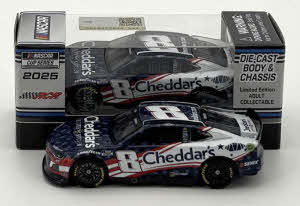 2025 Kyle Busch #8 Cheddar's Salutes / Chevrolet Camaro ZL1 NASCAR 1/64 diecast, by Action Lionel. The Richard Childress Racing #8 Cheddar's Scratch Kitchen Salutes Chevrolet Camaro ZL1 was raced by Kyle Busch in select events during the 2025 NASCAR Cup season. This patriotic special paint scheme salutes America’s military members.