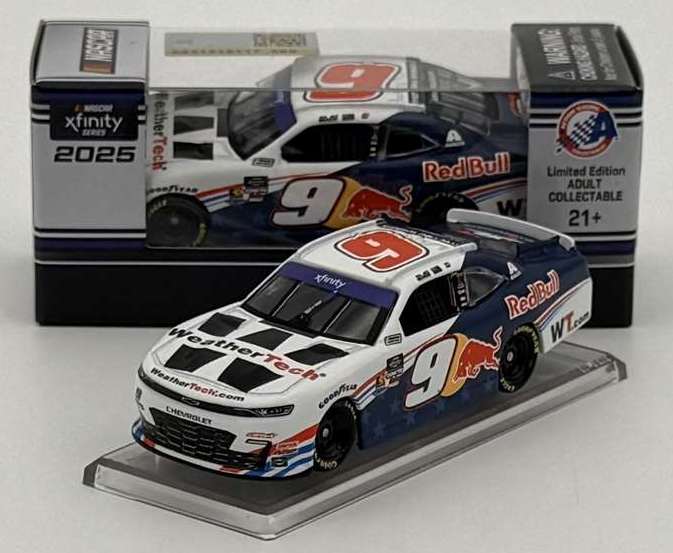 2025 Shane Van Gisbergen #9 WeatherTech / Red Bull / Chevrolet Camaro NASCAR 1/64 diecast, by Action Lionel. The JR Motorsports #9 WeatherTech Red Bull Chevrolet Camaro was raced to victory by Shane Van Gisbergen in the NASCAR xfinity Series, The Loop 110 at the Chicago Street Course on July 5, 2025. This diecast car will be displayed on a clear base.