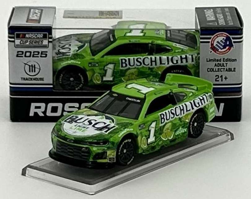 2025 Ross Chastain #1 Busch Light Lime / Chevrolet Camaro ZL1 NASCAR 1/64 diecast, by Action Lionel. The Trackhouse Racing #1 Busch Light Lime Chevrolet Camaro ZL1 was raced by Ross Chastain in the NASCAR Cup, Brickyard 400 at Indianapolis Motor Speedway on July 27, 2025. This diecast car will be displayed on a clear base.