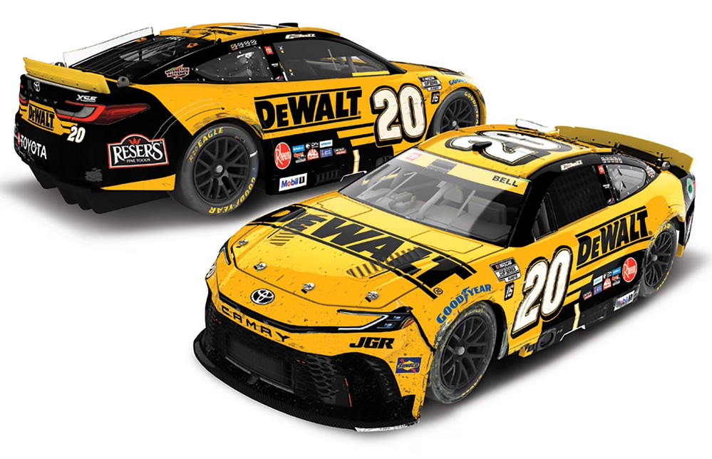 2025 Christopher Bell #20 DEWALT / Bristol Win / Raced Version / Toyota Camry XSE NASCAR 1/64 diecast, by Action Lionel. Christopher Bell raced this Joe Gibbs Racing #20 DEWALT Toyota Camry XSE to victory in the NASCAR Cup, Bass Pro Shops Night Race at Bristol Motor Speedway on September 13, 2025. This was Christopher Bell's 4th win of 2025 NASCAR Cup season. This win also completed the NASCAR Cup Series Playoff Round of 16 sweep for Joe Gibbs Racing.