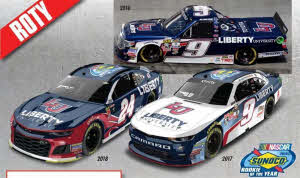 William Byron / Liberty University / NASCAR Rookie of the Year 3-Car 1/64 Diecast Set, by Action Lionel. When he was named Sunoco Rookie of the Year in NASCAR's top series at the end of the 2018 season, William Byron entered the history books as just the 2nd driver to earn Sunoco Rookie of the Year honors in consecutive years in all 3 of the sport's national series. While driving for JR Motorsports, Byron raced to a Sunoco Rookie of the Year title and the Championship in the NASCAR xfinity Series in 2017. In 2016, he took the Rookie crown in the NASCAR Camping World Truck Series as a driver for Kyle Busch Motorsports. Now, for the 1st time, Lionel Racing is excited to present a 3 car set that replicates all of Byron's Sunoco Rookie of the Year 1/64 diecast. This set also marks the 1st time that Bryon's 2016 Sunoco Rookie of the Year Truck has been made available to collectors.