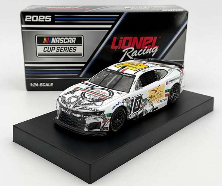 2025 Ty Dillon #10 Roma 70th Anniversary / Sea Best / Chevrolet Camaro ZL1 NASCAR 1/24 diecast, by Action Lionel Racing. The Kaulig Racing #10 Roma 70th Anniversary Sea Best Chevrolet Camaro ZL1 was raced by Ty Dillon in the 2025 NASCAR Cup races at Richmond and Daytona. This was the Italian food product brand Roma's 70th anniversary.
