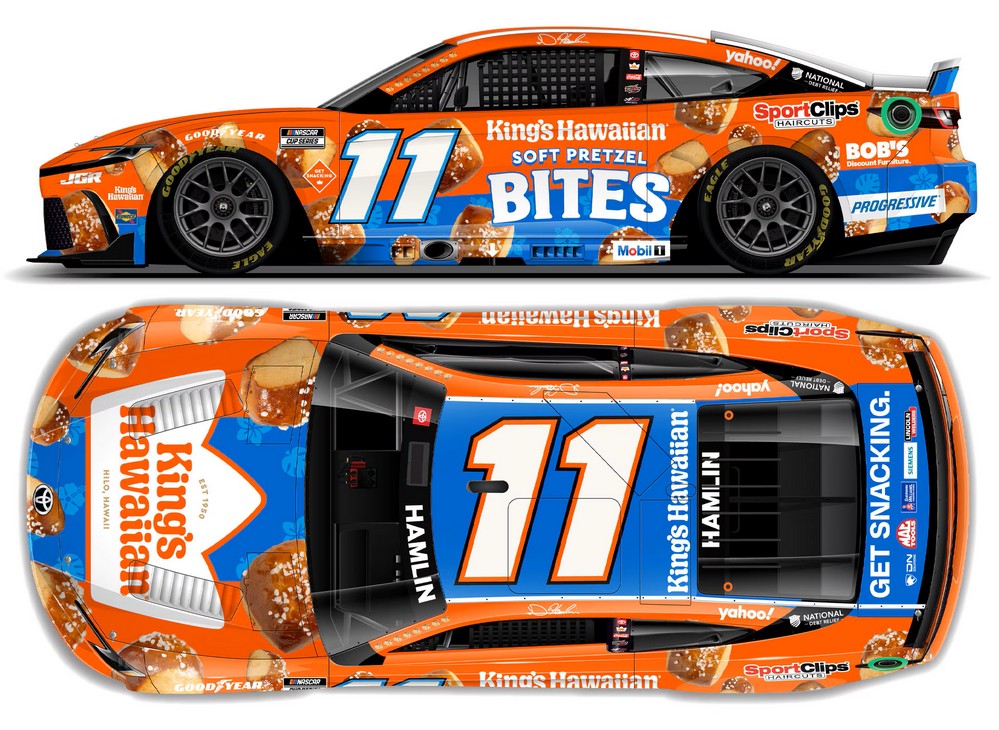 2025 Denny Hamlin #11 King's Hawaiian Soft Pretzel Bites / Toyota Camry XSE NASCAR 1/24 diecast, by Action Lionel Racing. The Joe Gibbs Racing #11 King's Hawaiian Soft Pretzel Bites Toyota Camry XSE was raced by Denny Hamlin in the NASCAR Cup, Bass Pro Shops Night Race at Bristol Motor Speedway on September 13, 2025.