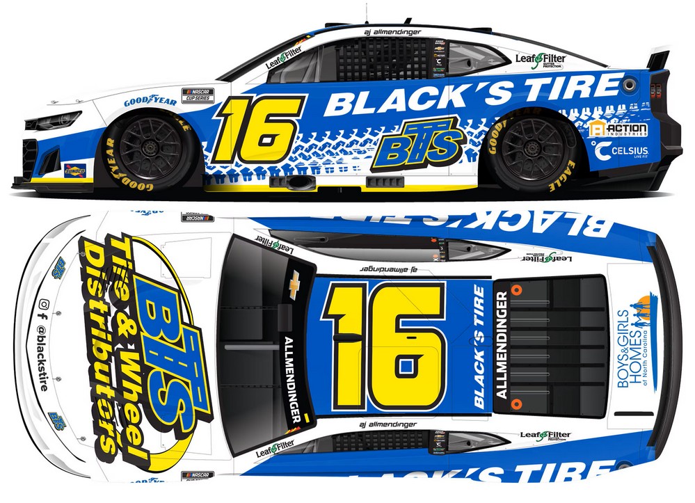 2025 A.J. Allmendinger #16 Black's Tire / Chevrolet Camaro ZL1 NASCAR 1/24 diecast, by Action Lionel Racing. The Kaulig Racing #16 Black's Tire Service Chevrolet Camaro ZL1 was raced by A.J. Allmendinger in multiple events during the 2025 NASCAR Cup season. Black's Tire Service has more than 70 locations in North and South Carolina.