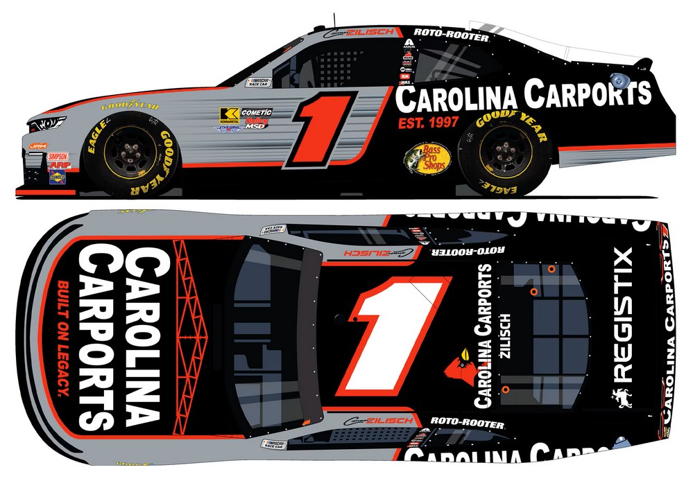 2026 Connor Zilisch #1 Carolina Carports / Chevrolet NASCAR 1/24 diecast, by Action Lionel Racing. The JR Motorsports #1 Carolina Carports Chevrolet will be raced by Connor Zilisch during the 2026 NASCAR O’Reilly Auto Parts Series season.
